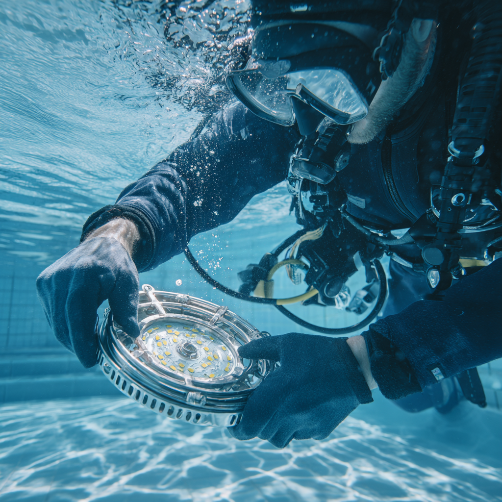 Montaje de componentes técnicos bajo el agua, como filtros, luces, válvulas, sensores o dispositivos de decoración. Se ejecuta según especificaciones técnicas y garantizando fijación resistente a inmersión prolongada.